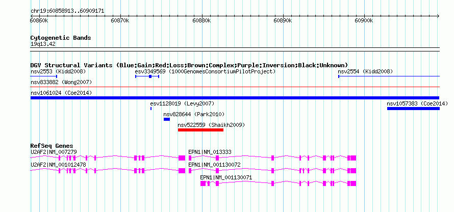 | | Variant Type | CNV gain | | Copy Number | | | Allele State | | | Allele Origin | | | Probe Count | | | Validation Flag | | | Merged Status | M | | Merged Variants | | | Supporting Variants | nssv3570431 | | Samples | | | Known Genes | EPN1, U2AF2 | | Method | SNP array | | Analysis | Affymetrix SNP array copy number analysis | | Platform | Affymetrix SNP Array 6.0 | | Comments | | | Reference | Coe_et_al_2014 | | Pubmed ID | 25217958 | | Accession Number(s) | nsv1061024