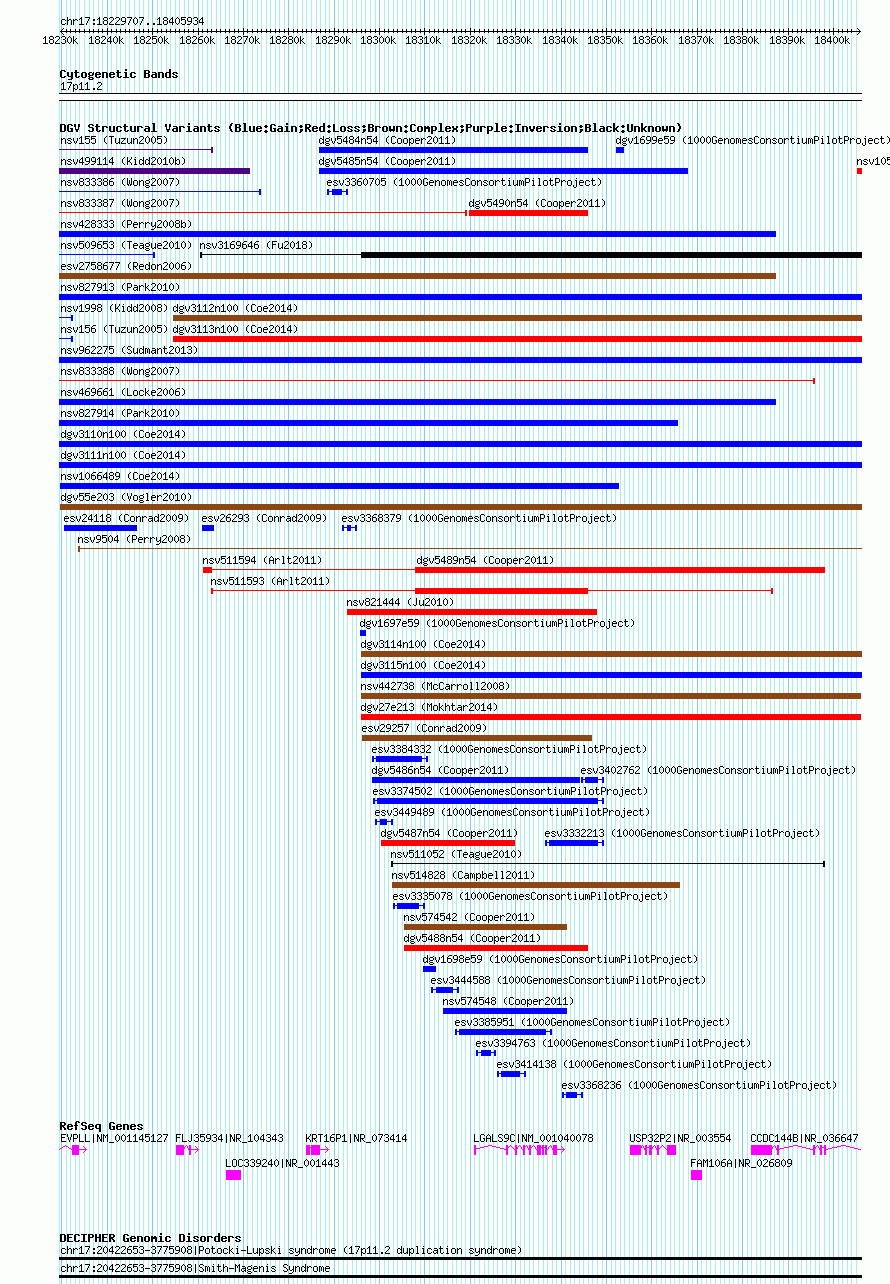 Variant DetailsVariant: nsv1061073| Internal ID | 19150292 | | Landmark | | | Location Information | | | Cytoband | 17p11.2 | | Allele length | | Assembly | Allele length | | hg38 | 176228 | | hg19 | 176228 | | hg18 | 176228 |