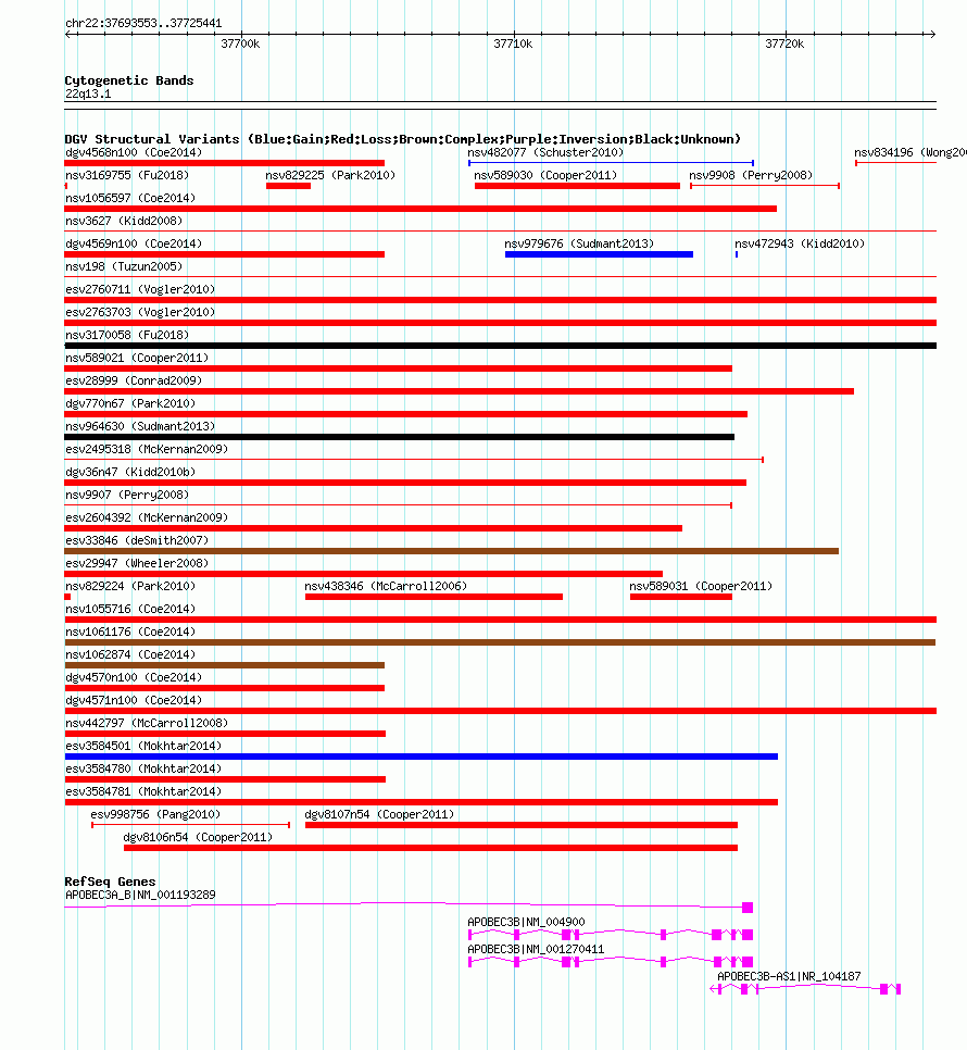 Variant DetailsVariant: nsv1061176| Internal ID | 19150395 | | Landmark | | | Location Information | | | Cytoband | 22q13.1 | | Allele length | | Assembly | Allele length | | hg38 | 31889 | | hg19 | 31889 | | hg18 | 31889 |