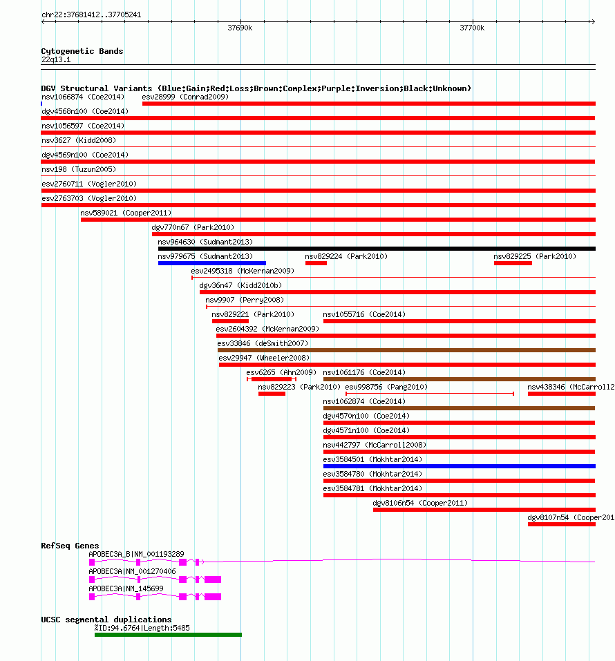 | Variant Type | CNV loss | Copy Number | | Allele State | | Allele Origin | | Probe Count | | Validation Flag | | Merged Status | M | Merged Variants | dgv4569n100 | Supporting Variants | nssv3600897, nssv3600900, nssv3600904, nssv3600908, nssv3734214, nssv3600905, nssv3600911, nssv3600906, nssv3600907, nssv3600899, nssv3600902, nssv3734213, nssv3600901, nssv3734215, nssv3600896, nssv3600903, nssv3600909, nssv3600910, nssv3600898 | Samples | | Known Genes | APOBEC3A, APOBEC3A_B | Method | SNP array | Analysis | Affymetrix SNP array copy number analysis | Platform | Affymetrix SNP Array 6.0 | Comments | | Reference | Coe_et_al_2014 | Pubmed ID | 25217958 | Accession Number(s) | nsv1061241