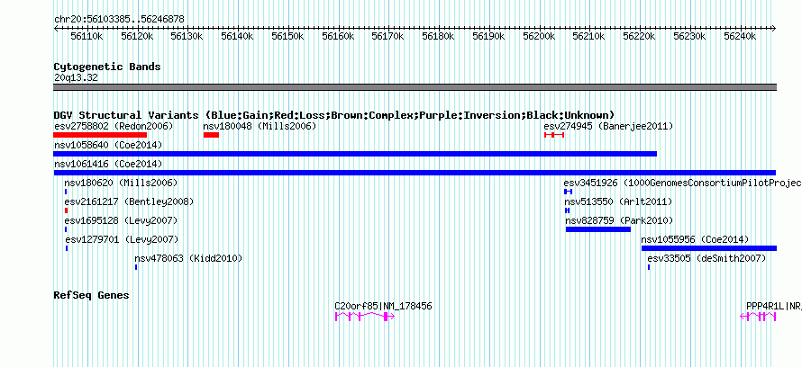 Variant DetailsVariant: nsv1061416| Internal ID | 18803947 | | Landmark | | | Location Information | | | Cytoband | 20q13.32 | | Allele length | | Assembly | Allele length | | hg38 | 143494 | | hg19 | 143494 | | hg18 | 143494 |