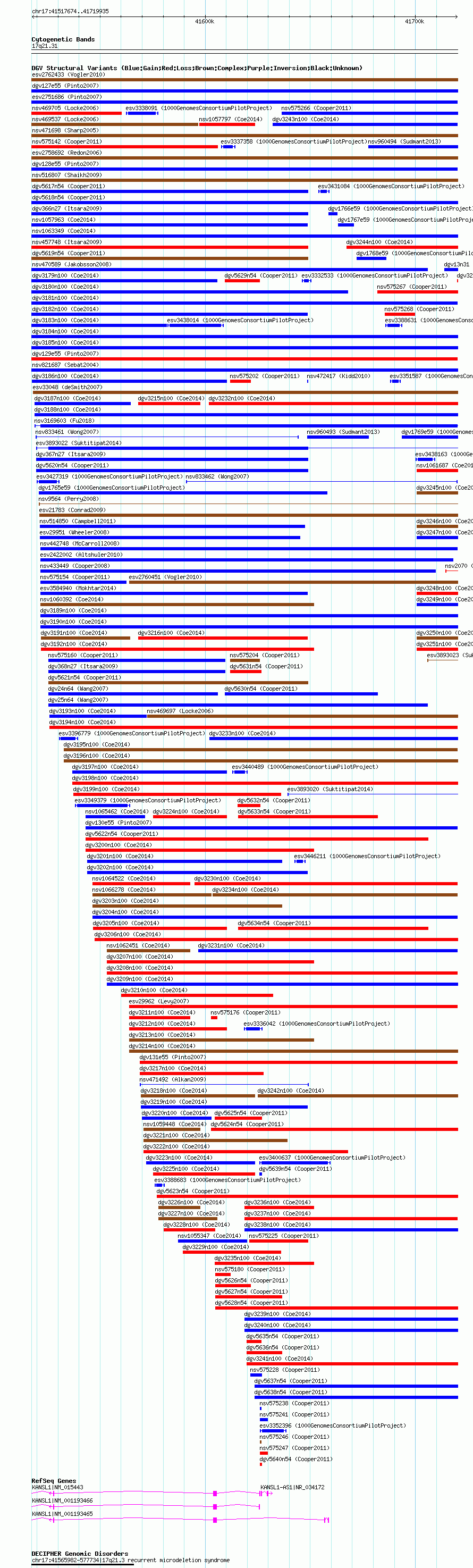 | | Variant Type | CNV gain | | Copy Number | | | Allele State | | | Allele Origin | | | Probe Count | | | Validation Flag | | | Merged Status | M | | Merged Variants | dgv3181n100 | | Supporting Variants | nssv3545245, nssv3719498, nssv3545252, nssv3719507, nssv3719488, nssv3545235, nssv3719508, nssv3545243, nssv3719495, nssv3719497, nssv3719504, nssv3545262, nssv3545261, nssv3545242, nssv3719501, nssv3719489, nssv3719493, nssv3719500, nssv3545260, nssv3719499, nssv3545253, nssv3719486, nssv3545240, nssv3719510, nssv3545246, nssv3545257, nssv3719505, nssv3719492, nssv3719491, nssv3545249, nssv3545258, nssv3545256, nssv3545247, nssv3719490, nssv3719503, nssv3545236, nssv3545233, nssv3719487, nssv3545254, nssv3719502, nssv3545255, nssv3545250, nssv3545248, nssv3719509, nssv3719484, nssv3719496, nssv3719485, nssv3719483, nssv3545241, nssv3545237, nssv3545259, nssv3545263, nssv3545239, nssv3545234, nssv3719494, nssv3545251, nssv3545244, nssv3719506, nssv3545238 | | Samples | | | Known Genes | KANSL1, KANSL1-AS1, LOC644172 | | Method | SNP array | | Analysis | Affymetrix SNP array copy number analysis | | Platform | Affymetrix SNP Array 6.0 | | Comments | | | Reference | Coe_et_al_2014 | | Pubmed ID | 25217958 | | Accession Number(s) | nsv1061713