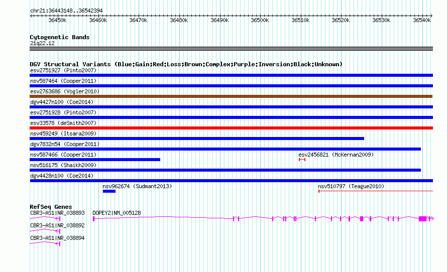 | | Variant Type | CNV gain | | Copy Number | | | Allele State | | | Allele Origin | | | Probe Count | | | Validation Flag | | | Merged Status | M | | Merged Variants | dgv4428n100 | | Supporting Variants | nssv3600188 | | Samples | | | Known Genes | CBR3-AS1, DOPEY2 | | Method | SNP array | | Analysis | Affymetrix SNP array copy number analysis | | Platform | Affymetrix SNP Array 6.0 | | Comments | | | Reference | Coe_et_al_2014 | | Pubmed ID | 25217958 | | Accession Number(s) | nsv1061961
