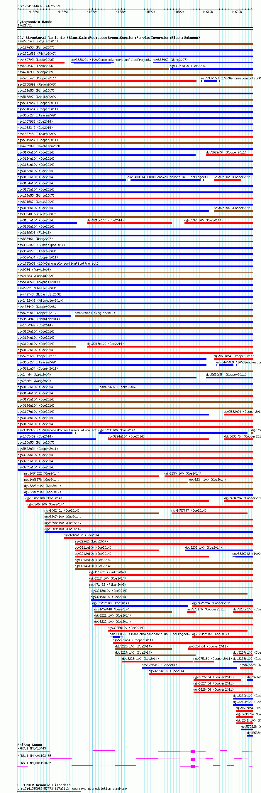 Variant DetailsVariant: nsv1062174| Internal ID | 19151393 | | Landmark | | | Location Information | | | Cytoband | 17q21.31 | | Allele length | | Assembly | Allele length | | hg38 | 81248 | | hg19 | 81248 | | hg18 | 81242 |