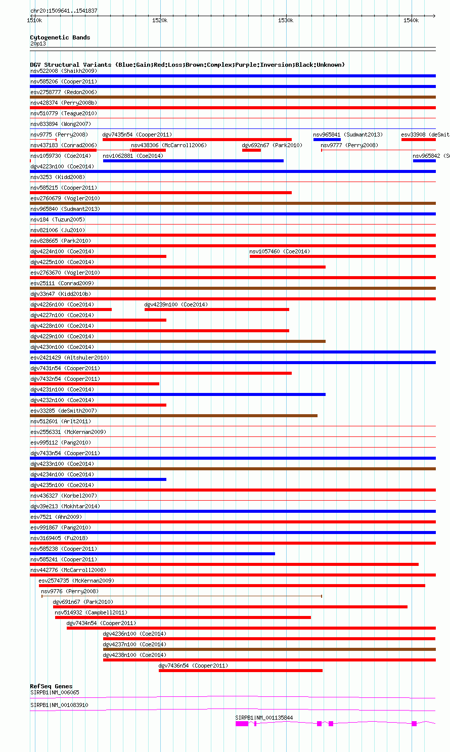| | Variant Type | CNV gain+loss | | Copy Number | | | Allele State | | | Allele Origin | | | Probe Count | | | Validation Flag | | | Merged Status | M | | Merged Variants | dgv4233n100 | | Supporting Variants | nssv3599071, nssv3599096, nssv3599081, nssv3599090, nssv3734681, nssv3734684, nssv3599091, nssv3734675, nssv3599079, nssv3734686, nssv3734677, nssv3599082, nssv3599066, nssv3599094, nssv3599085, nssv3734685, nssv3599083, nssv3599097, nssv3599067, nssv3599089, nssv3599088, nssv3599092, nssv3599068, nssv3599086, nssv3599080, nssv3734676, nssv3599095, nssv3734680, nssv3734678, nssv3599087, nssv3599070, nssv3599075, nssv3599098, nssv3599074, nssv3599072, nssv3734679, nssv3734683, nssv3599069, nssv3734682, nssv3599084, nssv3599073, nssv3599093, nssv3599065, nssv3599076, nssv3599064, nssv3599078, nssv3734674, nssv3599077 | | Samples | | | Known Genes | SIRPB1 | | Method | SNP array | | Analysis | Affymetrix SNP array copy number analysis | | Platform | Affymetrix SNP Array 6.0 | | Comments | | | Reference | Coe_et_al_2014 | | Pubmed ID | 25217958 | | Accession Number(s) | nsv1062208