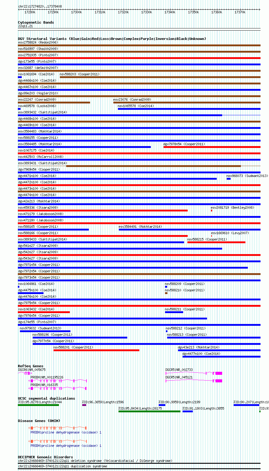 | Variant Type | CNV gain | Copy Number | | Allele State | | Allele Origin | | Probe Count | | Validation Flag | | Merged Status | M | Merged Variants | dgv4476n100 | Supporting Variants | nssv3587312 | Samples | | Known Genes | DGCR5, DGCR6, PRODH | Method | SNP array | Analysis | Affymetrix SNP array copy number analysis | Platform | Affymetrix SNP Array 6.0 | Comments | | Reference | Coe_et_al_2014 | Pubmed ID | 25217958 | Accession Number(s) | nsv1062286