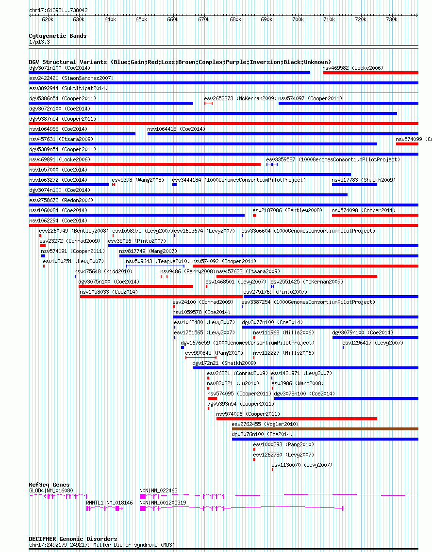 Variant DetailsVariant: nsv1062294| Internal ID | 19151513 | | Landmark | | | Location Information | | | Cytoband | 17p13.3 | | Allele length | | Assembly | Allele length | | hg38 | 124062 | | hg19 | 124062 | | hg18 | 124062 |
