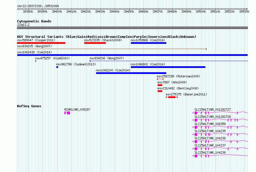 | Variant Type | CNV gain | Copy Number | | Allele State | | Allele Origin | | Probe Count | | Validation Flag | | Merged Status | M | Merged Variants | | Supporting Variants | nssv3737349 | Samples | | Known Genes | MCHR1, SLC25A17 | Method | SNP array | Analysis | Affymetrix SNP array copy number analysis | Platform | Affymetrix SNP Array 6.0 | Comments | | Reference | Coe_et_al_2014 | Pubmed ID | 25217958 | Accession Number(s) | nsv1062438