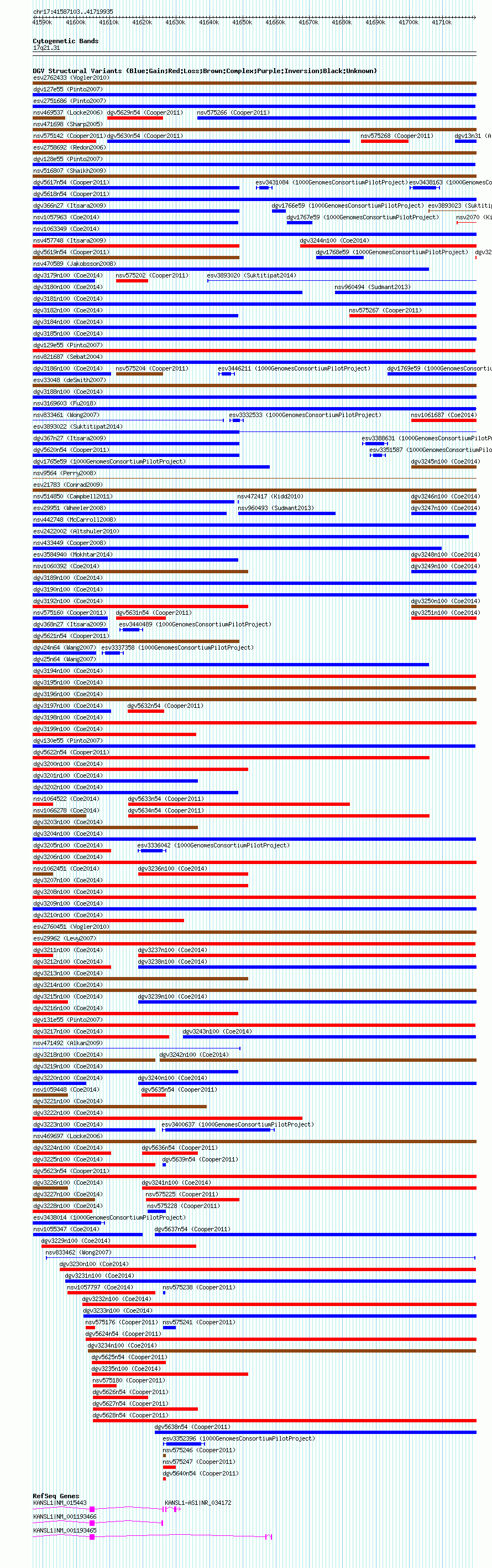 Variant DetailsVariant: nsv1062483| Internal ID | 19151702 | | Landmark | | | Location Information | | | Cytoband | 17q21.31 | | Allele length | | Assembly | Allele length | | hg38 | 132833 | | hg19 | 132833 | | hg18 | 132833 |