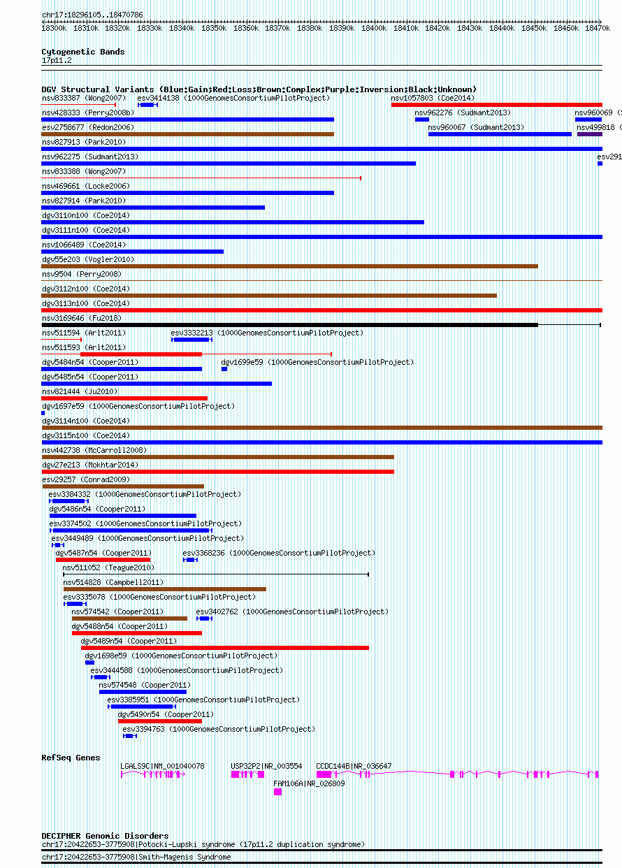 Variant DetailsVariant: nsv1062574| Internal ID | 19151793 | | Landmark | | | Location Information | | | Cytoband | 17p11.2 | | Allele length | | Assembly | Allele length | | hg38 | 174683 | | hg19 | 174682 | | hg18 | 174682 |