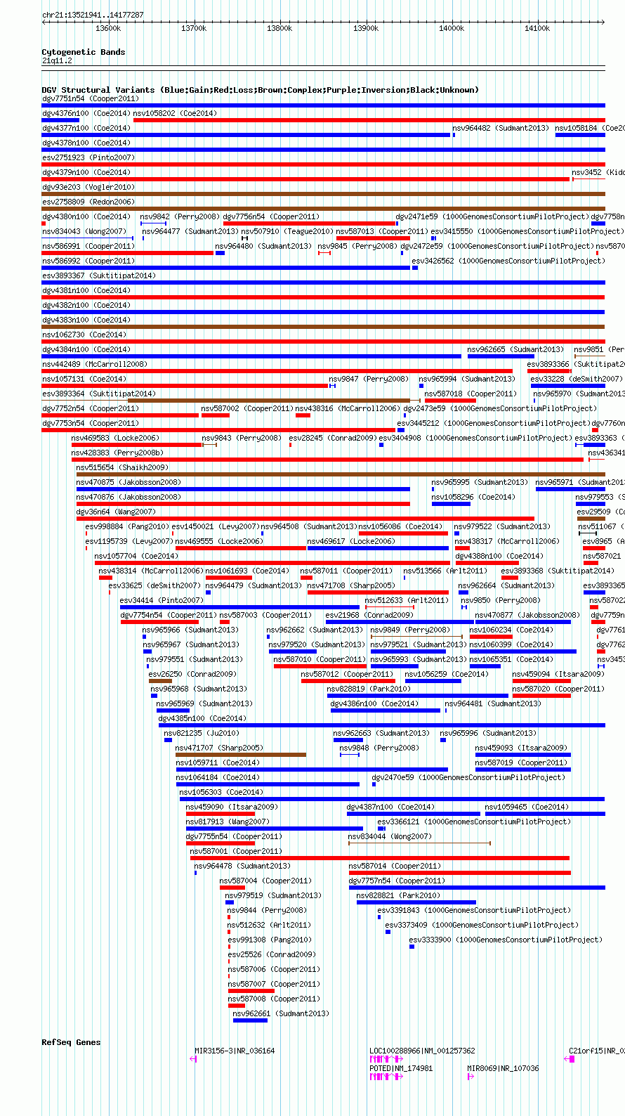 | | Variant Type | CNV gain | | Copy Number | | | Allele State | | | Allele Origin | | | Probe Count | | | Validation Flag | | | Merged Status | M | | Merged Variants | dgv4382n100 | | Supporting Variants | nssv3585314 | | Samples | | | Known Genes | C21orf15, LOC100288966, MIR3156-3, MIR8069, POTED | | Method | SNP array | | Analysis | Affymetrix SNP array copy number analysis | | Platform | Affymetrix SNP Array 6.0 | | Comments | | | Reference | Coe_et_al_2014 | | Pubmed ID | 25217958 | | Accession Number(s) | nsv1062576