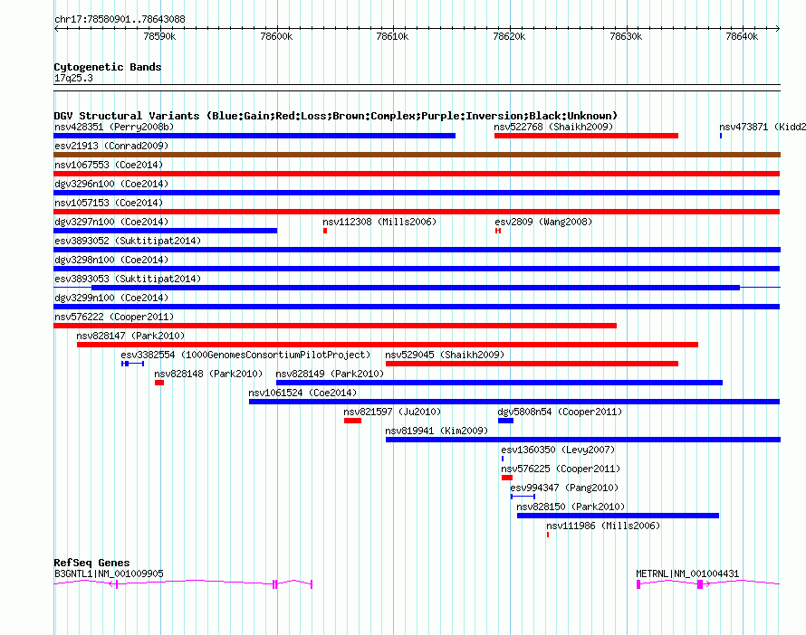 | | Variant Type | CNV gain | | Copy Number | | | Allele State | | | Allele Origin | | | Probe Count | | | Validation Flag | | | Merged Status | M | | Merged Variants | dgv3299n100 | | Supporting Variants | nssv3567911 | | Samples | | | Known Genes | B3GNTL1, METRNL | | Method | SNP array | | Analysis | Affymetrix SNP array copy number analysis | | Platform | Affymetrix SNP Array 6.0 | | Comments | | | Reference | Coe_et_al_2014 | | Pubmed ID | 25217958 | | Accession Number(s) | nsv1062646
