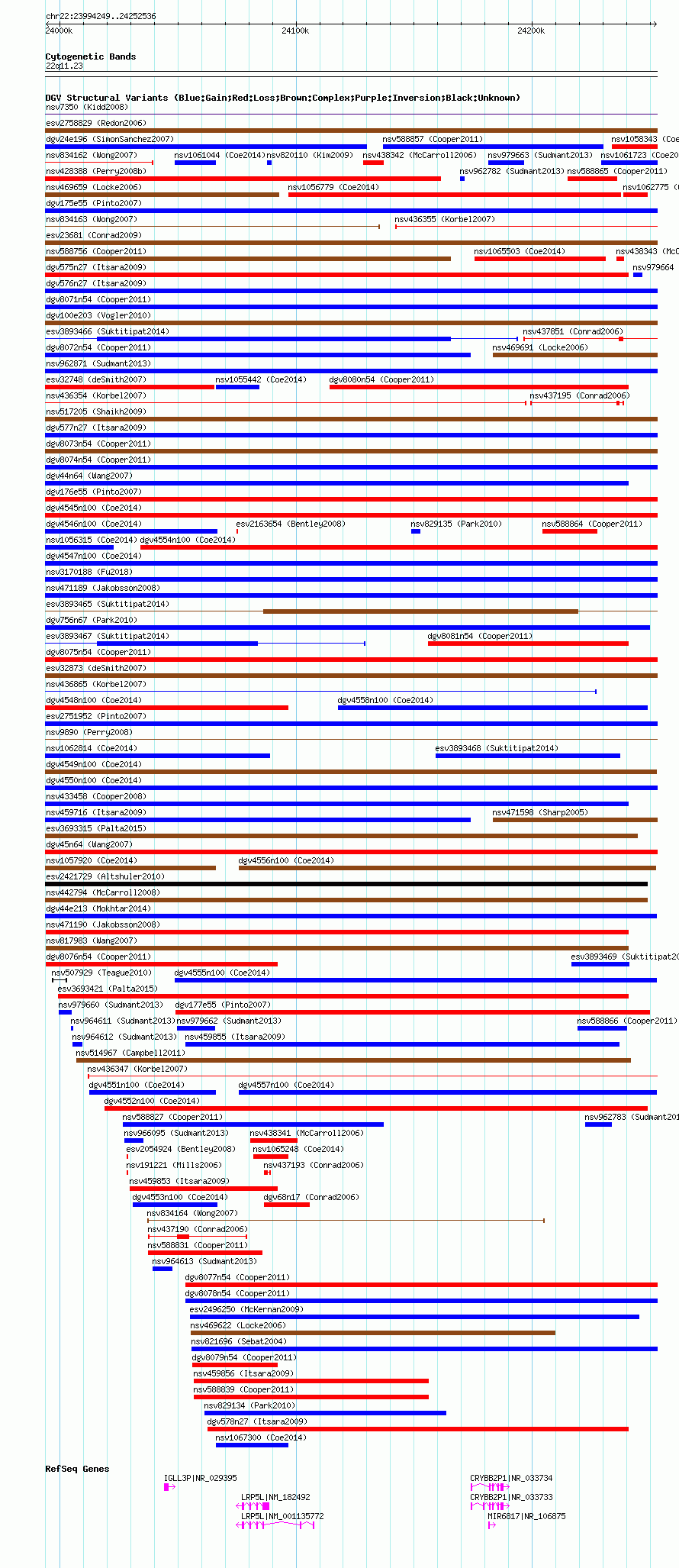 Variant DetailsVariant: nsv1062726| Internal ID | 19151945 | | Landmark | | | Location Information | | | Cytoband | 22q11.23 | | Allele length | | Assembly | Allele length | | hg38 | 258288 | | hg19 | 258288 | | hg18 | 258288 |