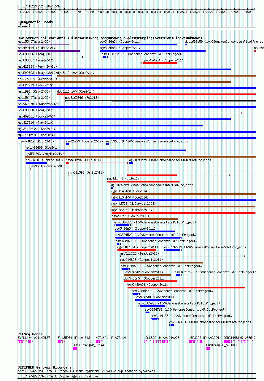 Variant DetailsVariant: nsv1062985| Internal ID | 19152204 | | Landmark | | | Location Information | | | Cytoband | 17p11.2 | | Allele length | | Assembly | Allele length | | hg38 | 181683 | | hg19 | 181683 | | hg18 | 181683 |