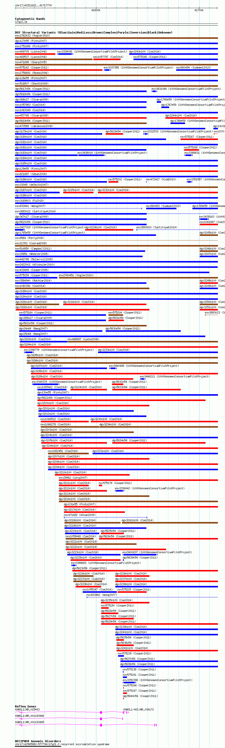 | | Variant Type | CNV gain | | Copy Number | | | Allele State | | | Allele Origin | | | Probe Count | | | Validation Flag | | | Merged Status | M | | Merged Variants | dgv3181n100 | | Supporting Variants | nssv3547218, nssv3547217, nssv3547216, nssv3547210, nssv3547214, nssv3547215, nssv3547219, nssv3547213, nssv3547220, nssv3720358, nssv3547221, nssv3547212, nssv3720357, nssv3547207, nssv3547211, nssv3547209, nssv3547208 | | Samples | | | Known Genes | KANSL1, KANSL1-AS1, LOC644172 | | Method | SNP array | | Analysis | Affymetrix SNP array copy number analysis | | Platform | Affymetrix SNP Array 6.0 | | Comments | | | Reference | Coe_et_al_2014 | | Pubmed ID | 25217958 | | Accession Number(s) | nsv1063014