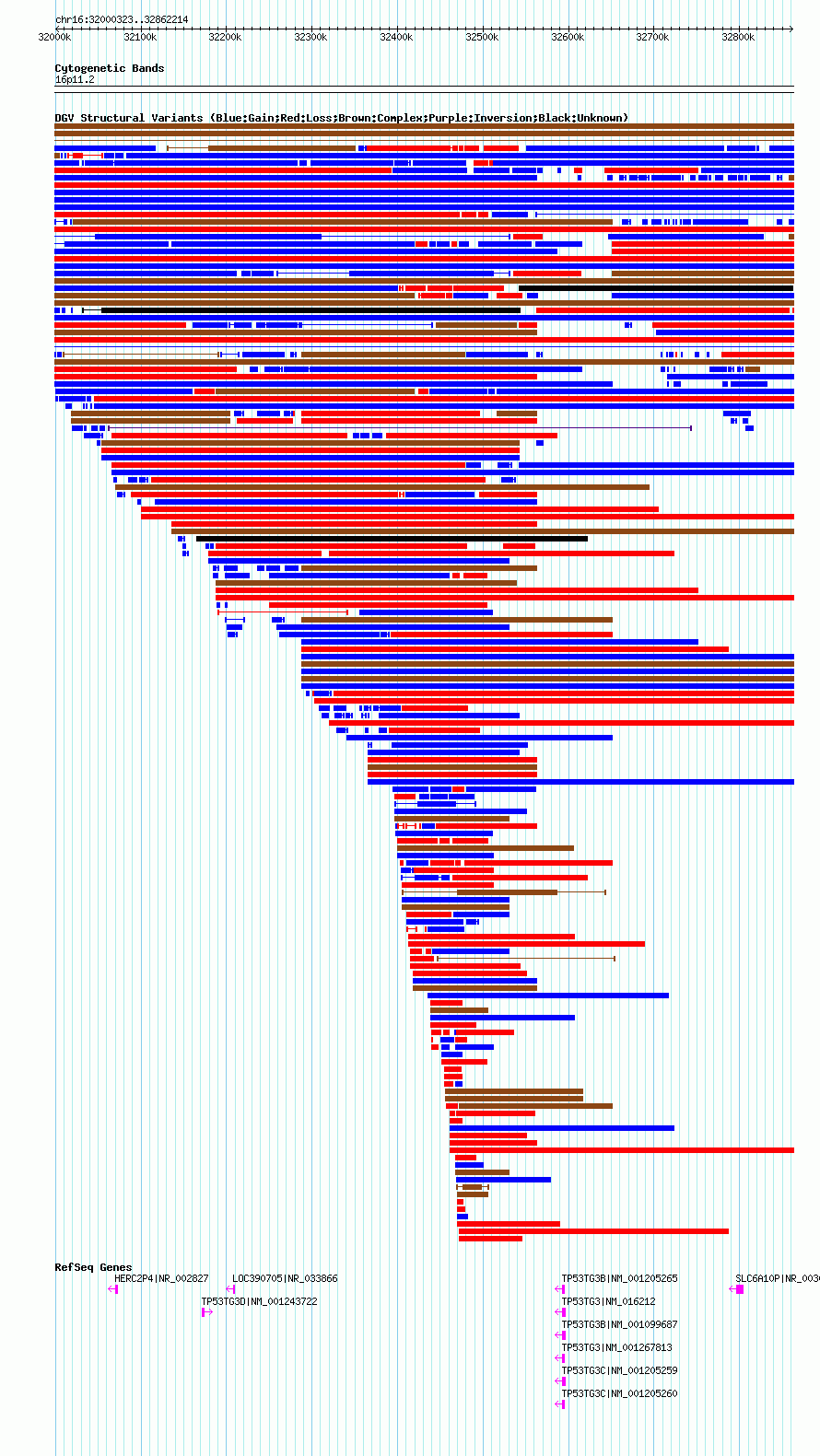 | | Variant Type | CNV loss | | Copy Number | | | Allele State | | | Allele Origin | | | Probe Count | | | Validation Flag | | | Merged Status | M | | Merged Variants | dgv2841n100 | | Supporting Variants | nssv3549383 | | Samples | | | Known Genes | HERC2P4, LOC390705, SLC6A10P, TP53TG3, TP53TG3B, TP53TG3C, TP53TG3D | | Method | SNP array | | Analysis | Affymetrix SNP array copy number analysis | | Platform | Affymetrix SNP Array 6.0 | | Comments | | | Reference | Coe_et_al_2014 | | Pubmed ID | 25217958 | | Accession Number(s) | nsv1063122