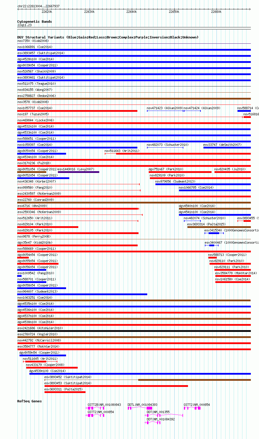 Variant DetailsVariant: nsv1063251| Internal ID | 19152470 | | Landmark | | | Location Information | | | Cytoband | 22q11.23 | | Allele length | | Assembly | Allele length | | hg38 | 54927 | | hg19 | 54934 | | hg18 | 54934 |