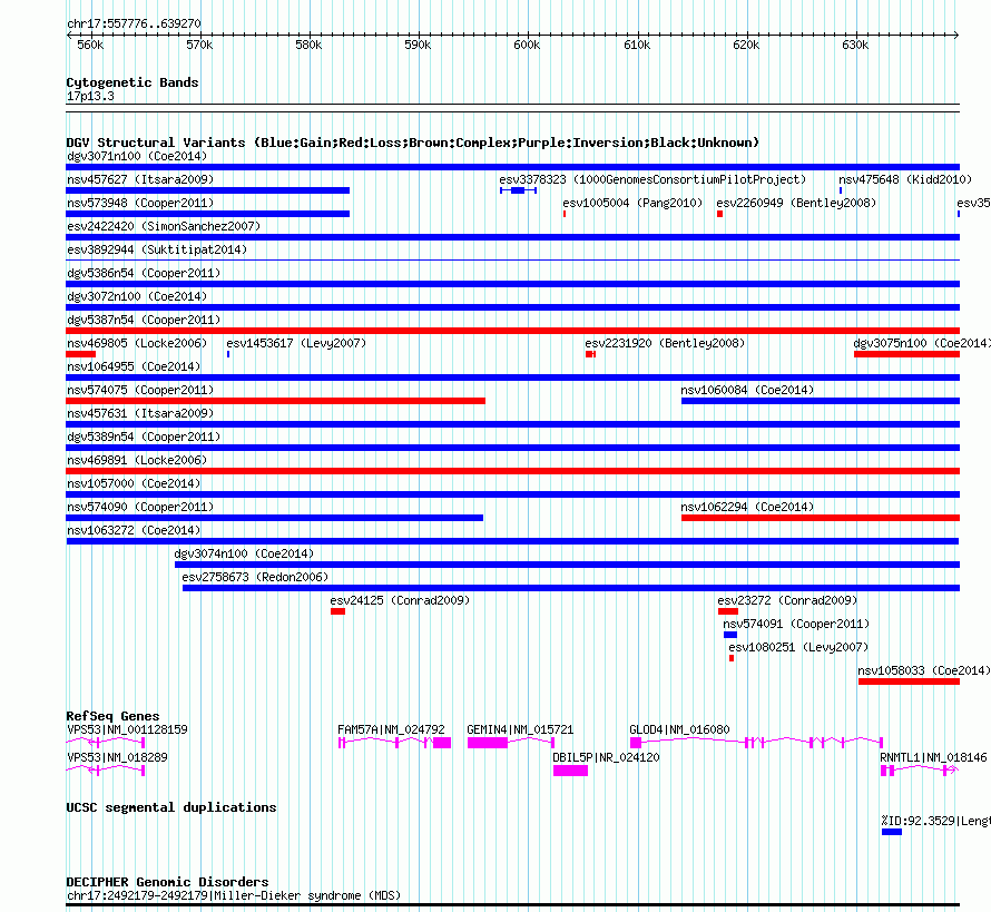 Variant DetailsVariant: nsv1063272| Internal ID | 18805803 | | Landmark | | | Location Information | | | Cytoband | 17p13.3 | | Allele length | | Assembly | Allele length | | hg38 | 81495 | | hg19 | 81495 | | hg18 | 81495 |