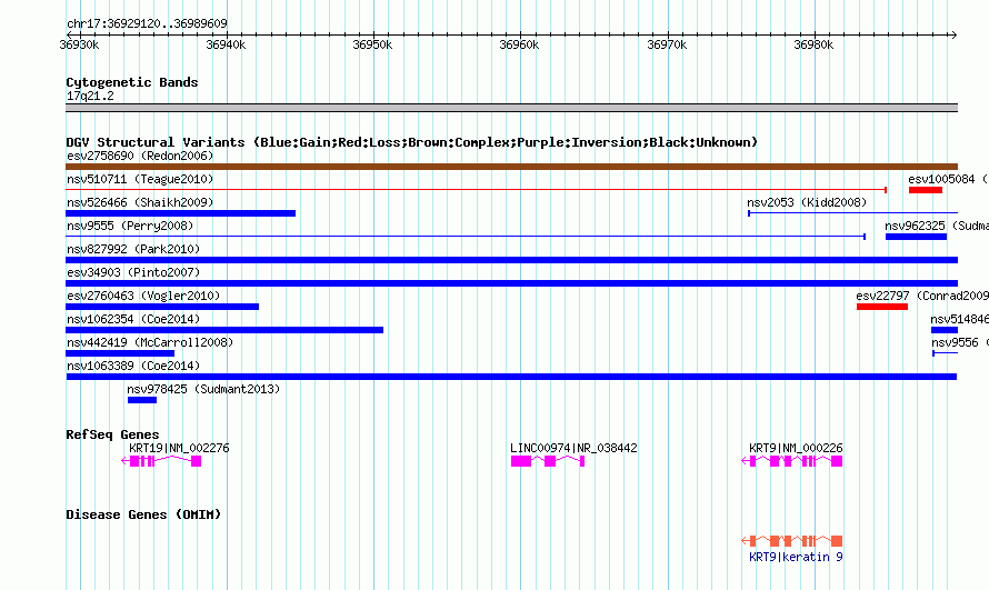 Variant DetailsVariant: nsv1063389| Internal ID | 19152608 | | Landmark | | | Location Information | | | Cytoband | 17q21.2 | | Allele length | | Assembly | Allele length | | hg38 | 60490 | | hg19 | 60490 | | hg18 | 60490 |
