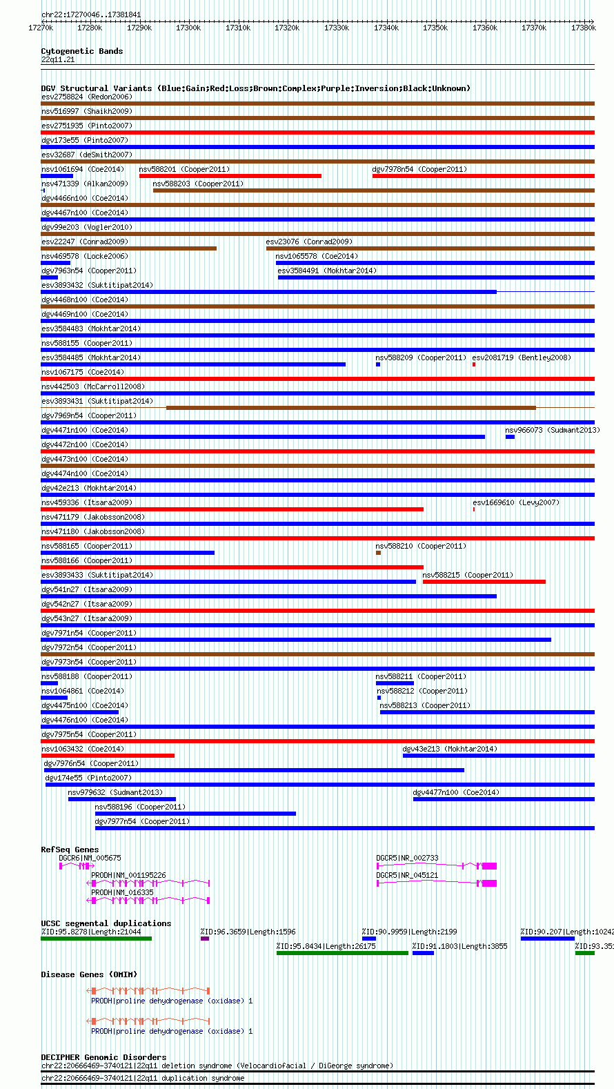 | Variant Type | CNV gain | Copy Number | | Allele State | | Allele Origin | | Probe Count | | Validation Flag | | Merged Status | M | Merged Variants | dgv4476n100 | Supporting Variants | nssv3731852 | Samples | | Known Genes | DGCR5, DGCR6, PRODH | Method | SNP array | Analysis | Affymetrix SNP array copy number analysis | Platform | Affymetrix SNP Array 6.0 | Comments | | Reference | Coe_et_al_2014 | Pubmed ID | 25217958 | Accession Number(s) | nsv1063399