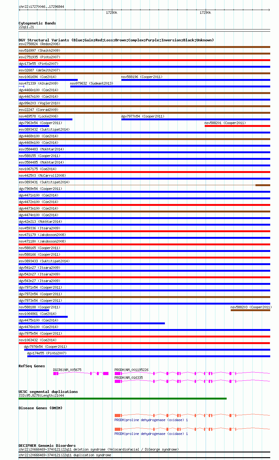 | Variant Type | CNV loss | Copy Number | | Allele State | | Allele Origin | | Probe Count | | Validation Flag | | Merged Status | M | Merged Variants | | Supporting Variants | nssv3587302 | Samples | | Known Genes | DGCR6, PRODH | Method | SNP array | Analysis | Affymetrix SNP array copy number analysis | Platform | Affymetrix SNP Array 6.0 | Comments | | Reference | Coe_et_al_2014 | Pubmed ID | 25217958 | Accession Number(s) | nsv1063432