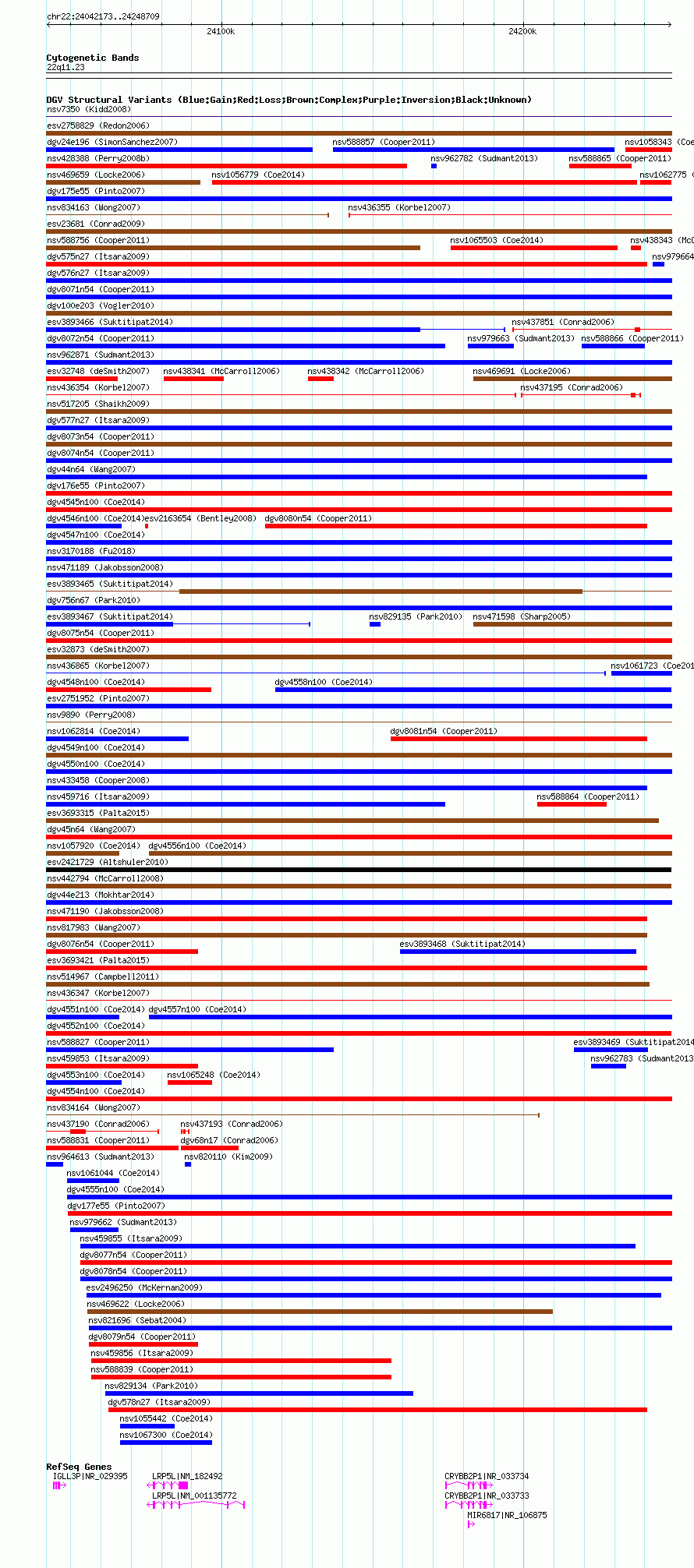 Variant DetailsVariant: nsv1063503| Internal ID | 19152722 | | Landmark | | | Location Information | | | Cytoband | 22q11.23 | | Allele length | | Assembly | Allele length | | hg38 | 206537 | | hg19 | 206537 | | hg18 | 206537 |