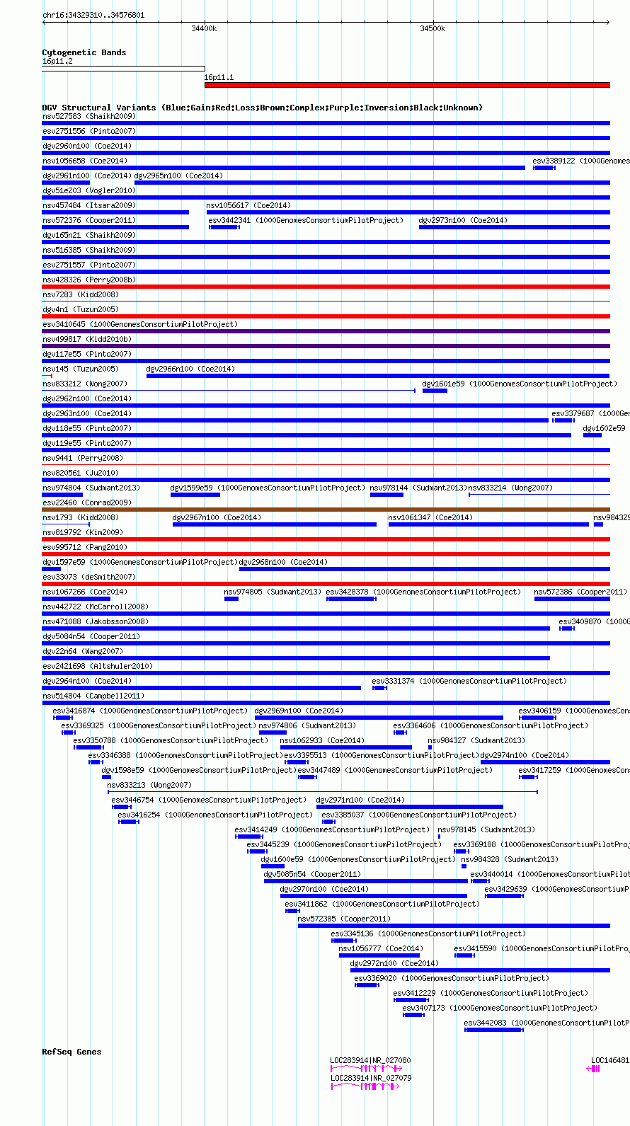Variant DetailsVariant: nsv1063520| Internal ID | 19152739 | | Landmark | | | Location Information | | | Cytoband | 16p11.1 | | Allele length | | Assembly | Allele length | | hg38 | 247492 | | hg19 | 247492 | | hg18 | 247492 |