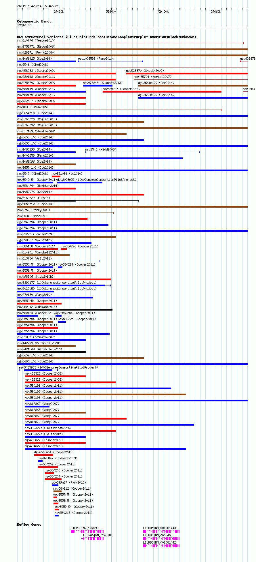 Variant DetailsVariant: nsv1063558| Internal ID | 19152777 | | Landmark | | | Location Information | | | Cytoband | 19q13.42 | | Allele length | | Assembly | Allele length | | hg38 | 44007 | | hg19 | 43988 | | hg18 | 43988 |