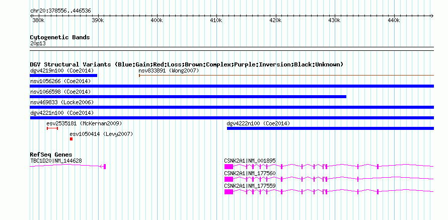 | | Variant Type | CNV gain | | Copy Number | | | Allele State | | | Allele Origin | | | Probe Count | | | Validation Flag | | | Merged Status | M | | Merged Variants | dgv4221n100 | | Supporting Variants | nssv3589956 | | Samples | | | Known Genes | CSNK2A1, TBC1D20 | | Method | SNP array | | Analysis | Affymetrix SNP array copy number analysis | | Platform | Affymetrix SNP Array 6.0 | | Comments | | | Reference | Coe_et_al_2014 | | Pubmed ID | 25217958 | | Accession Number(s) | nsv1063600