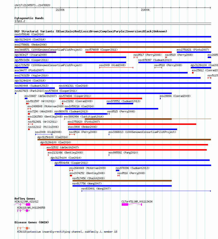| | Variant Type | CNV gain | | Copy Number | | | Allele State | | | Allele Origin | | | Probe Count | | | Validation Flag | | | Merged Status | M | | Merged Variants | dgv3124n100 | | Supporting Variants | nssv3720023 | | Samples | | | Known Genes | C17orf51, KCNJ12, KCNJ18 | | Method | SNP array | | Analysis | Affymetrix SNP array copy number analysis | | Platform | Affymetrix SNP Array 6.0 | | Comments | | | Reference | Coe_et_al_2014 | | Pubmed ID | 25217958 | | Accession Number(s) | nsv1063825