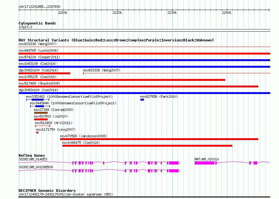 Variant DetailsVariant: nsv1063834Internal ID | 18806365 | Landmark | | Location Information | | Cytoband | 17p13.3 | Allele length | Assembly | Allele length | hg38 | 45943 | hg19 | 45943 | hg18 | 45943 |