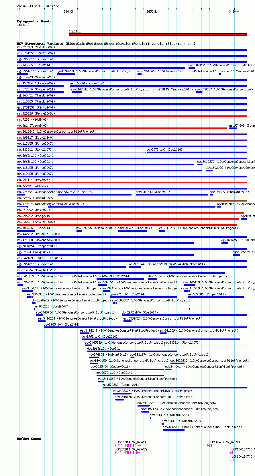 Variant DetailsVariant: nsv1064185 | Internal ID | 19153404 | | Landmark | | | Location Information | | | Cytoband | 16p11.1 | | Allele length | | Assembly | Allele length | | hg38 | 277391 | | hg19 | 277391 | | hg18 | 277391 |