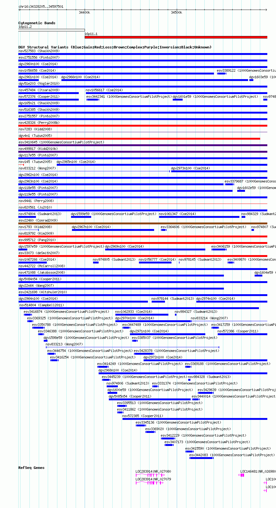 Variant DetailsVariant: nsv1064567| Internal ID | 19153786 | | Landmark | | | Location Information | | | Cytoband | 16p11.1 | | Allele length | | Assembly | Allele length | | hg38 | 269297 | | hg19 | 269297 | | hg18 | 269297 |