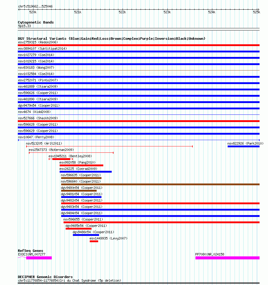 Variant DetailsVariant: nsv10647 | Internal ID | 15845610 | | Landmark | | | Location Information | | | Cytoband | 5p15.33 | | Allele length | | Assembly | Allele length | | hg38 | 5385 | | hg19 | 5385 | | hg18 | 5385 | | hg17 | 5385 |