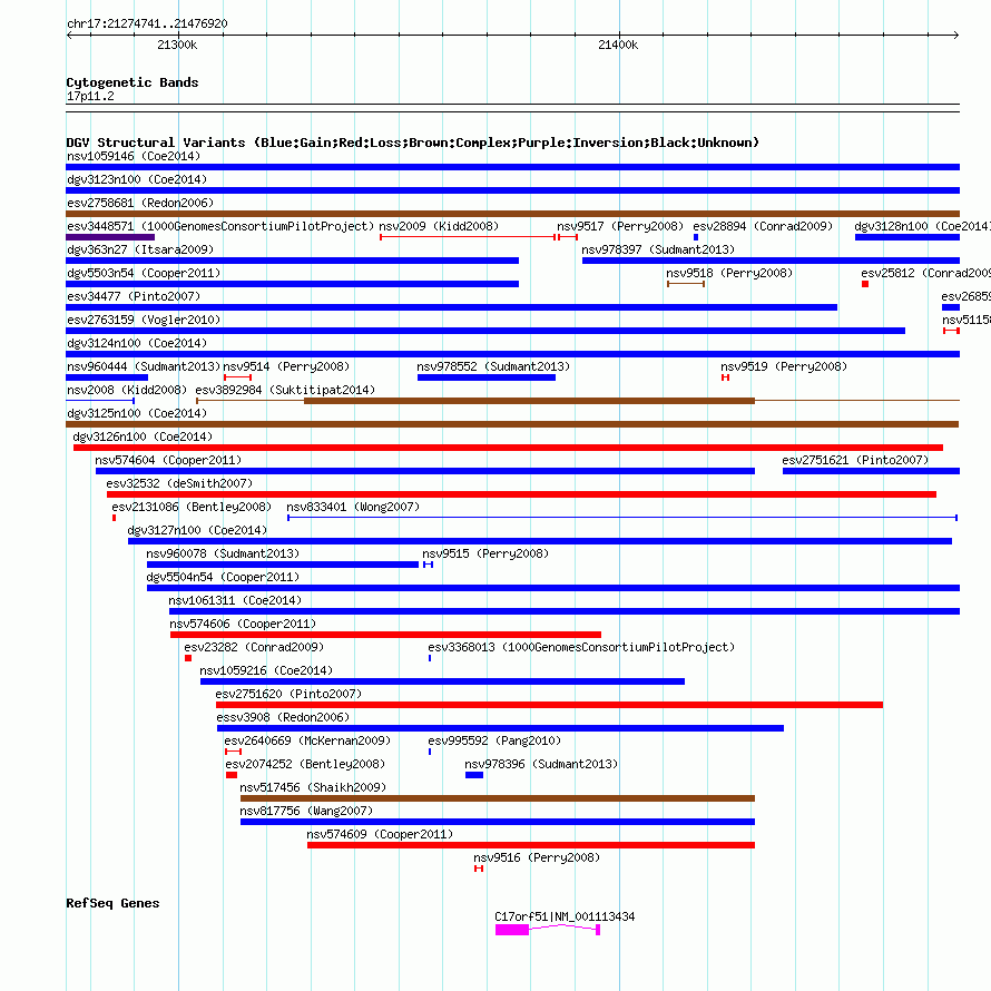 Variant DetailsVariant: nsv1064710| Internal ID | 19153929 | | Landmark | | | Location Information | | | Cytoband | 17p11.2 | | Allele length | | Assembly | Allele length | | hg38 | 198642 | | hg19 | 202180 | | hg18 | 202180 |