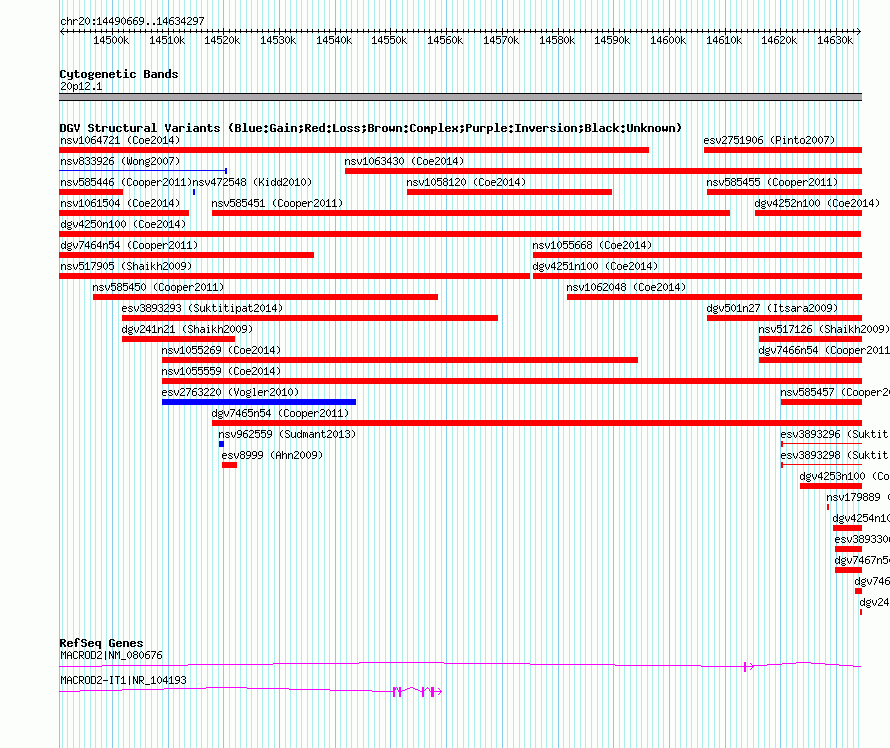 | | Variant Type | CNV loss | | Copy Number | | | Allele State | | | Allele Origin | | | Probe Count | | | Validation Flag | | | Merged Status | M | | Merged Variants | dgv4250n100 | | Supporting Variants | nssv3599408 | | Samples | | | Known Genes | MACROD2, MACROD2-IT1 | | Method | SNP array | | Analysis | Affymetrix SNP array copy number analysis | | Platform | Affymetrix SNP Array 6.0 | | Comments | | | Reference | Coe_et_al_2014 | | Pubmed ID | 25217958 | | Accession Number(s) | nsv1064738