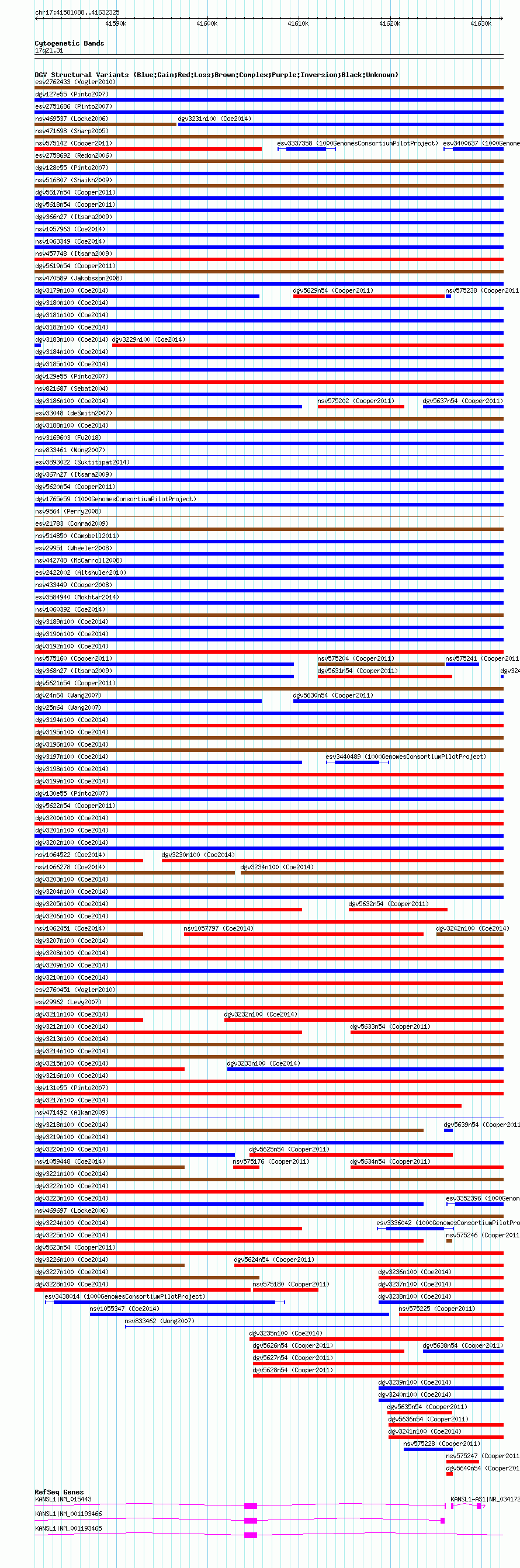 Variant DetailsVariant: nsv1065000| Internal ID | 19154219 | | Landmark | | | Location Information | | | Cytoband | 17q21.31 | | Allele length | | Assembly | Allele length | | hg38 | 51238 | | hg19 | 51238 | | hg18 | 51238 |
