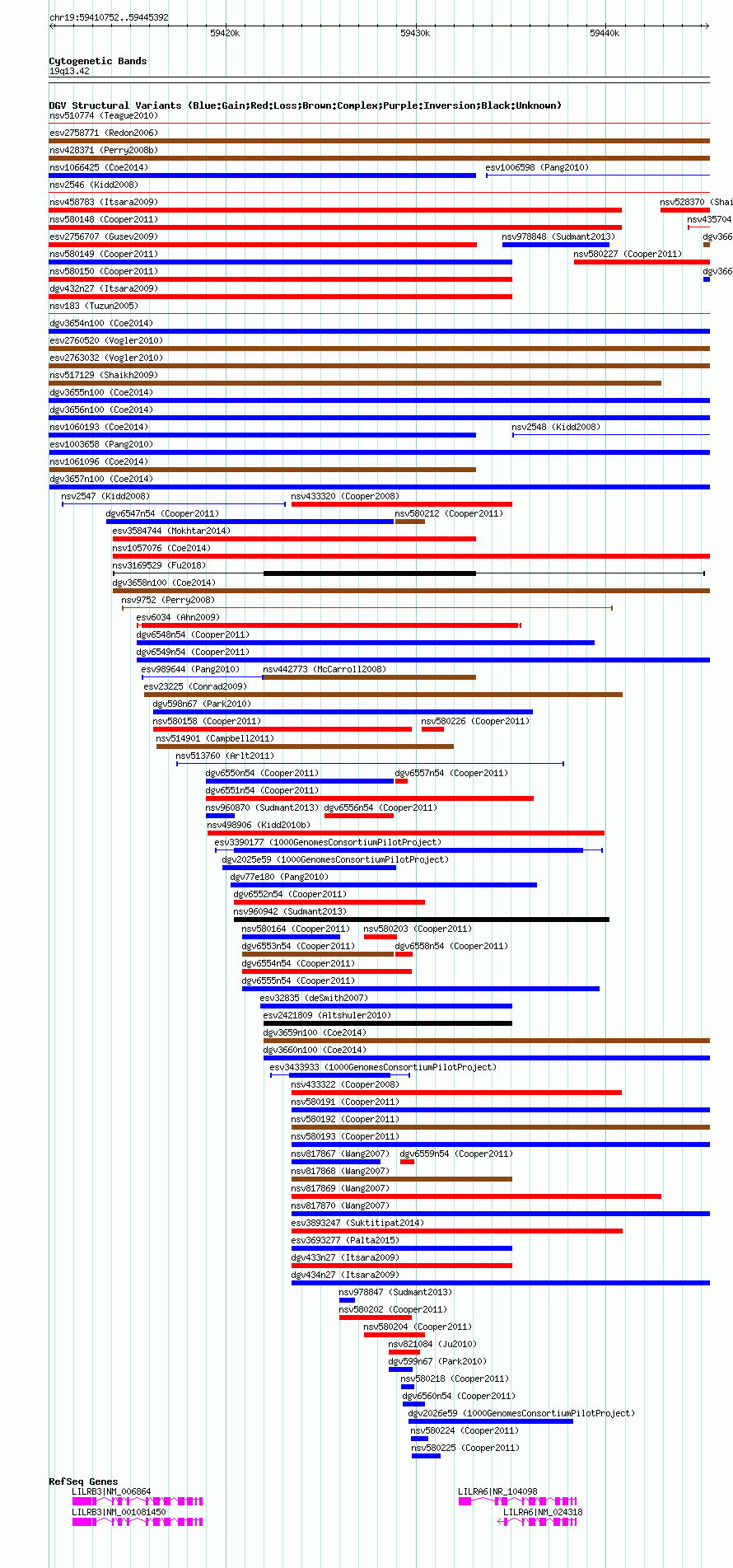 Variant DetailsVariant: nsv1065266| Internal ID | 19154485 | | Landmark | | | Location Information | | | Cytoband | 19q13.42 | | Allele length | | Assembly | Allele length | | hg38 | 34652 | | hg19 | 34641 | | hg18 | 34641 |