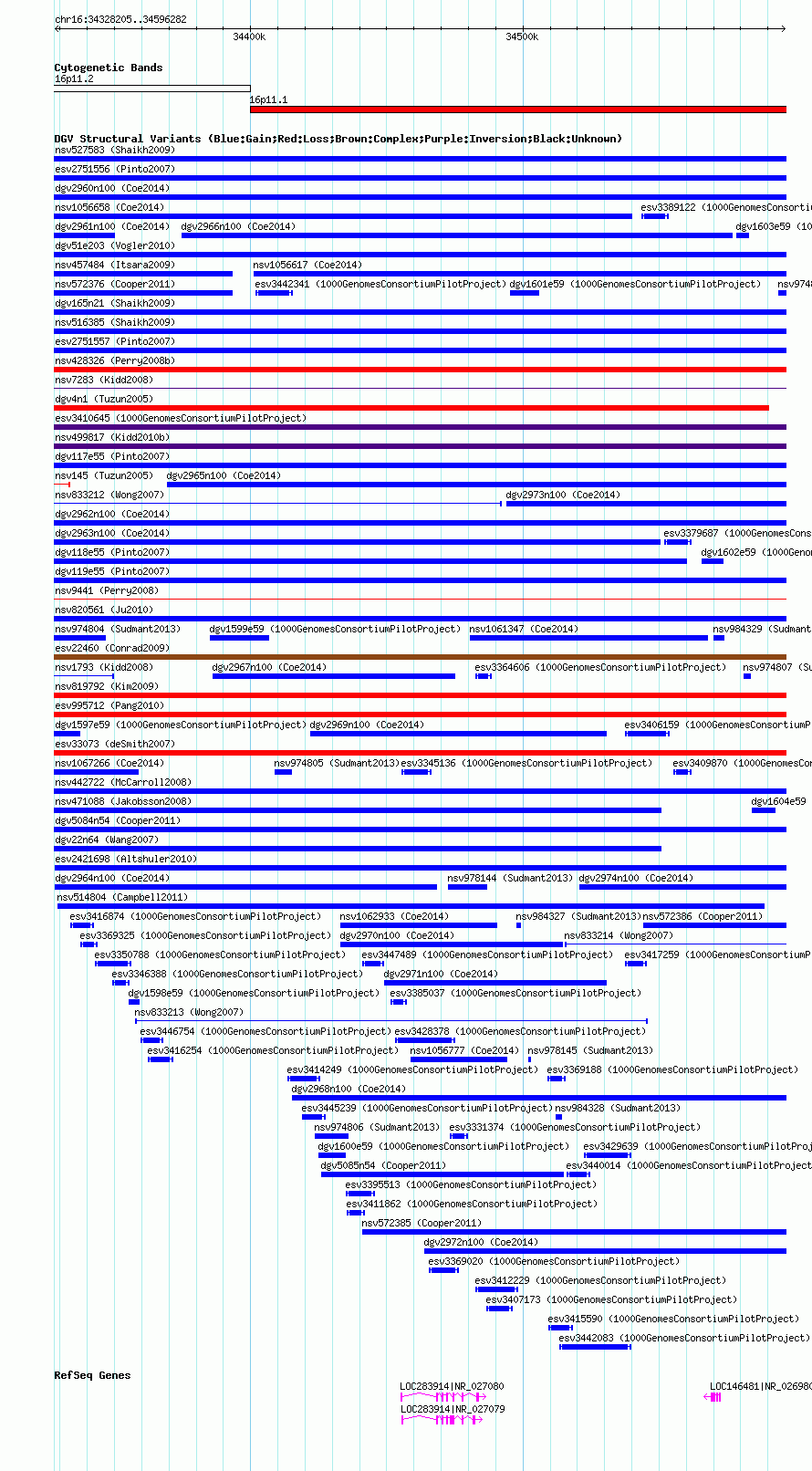 Variant DetailsVariant: nsv1065278| Internal ID | 19154497 | | Landmark | | | Location Information | | | Cytoband | 16p11.1 | | Allele length | | Assembly | Allele length | | hg38 | 268078 | | hg19 | 268078 | | hg18 | 268078 |
