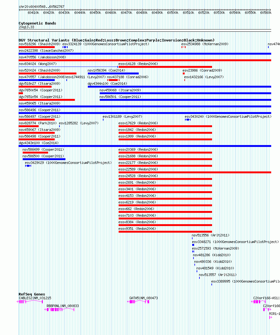 | | Variant Type | CNV gain | | Copy Number | | | Allele State | | | Allele Origin | | | Probe Count | | | Validation Flag | | | Merged Status | M | | Merged Variants | dgv4343n100 | | Supporting Variants | nssv3584457 | | Samples | | | Known Genes | C20orf166, C20orf166-AS1, CABLES2, GATA5, MIR1-1, RBBP8NL | | Method | SNP array | | Analysis | Affymetrix SNP array copy number analysis | | Platform | Affymetrix SNP Array 6.0 | | Comments | | | Reference | Coe_et_al_2014 | | Pubmed ID | 25217958 | | Accession Number(s) | nsv1065364