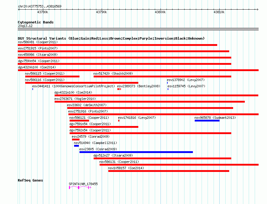| Variant Type | CNV loss | Copy Number | | Allele State | | Allele Origin | | Probe Count | | Validation Flag | | Merged Status | M | Merged Variants | dgv4320n100 | Supporting Variants | nssv3584845, nssv3584844 | Samples | | Known Genes | SPINT4 | Method | SNP array | Analysis | Affymetrix SNP array copy number analysis | Platform | Affymetrix SNP Array 6.0 | Comments | | Reference | Coe_et_al_2014 | Pubmed ID | 25217958 | Accession Number(s) | nsv1065614