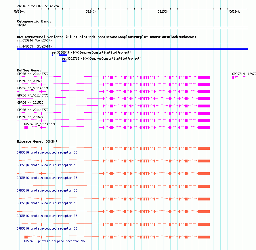 | | Variant Type | CNV gain | | Copy Number | | | Allele State | | | Allele Origin | | | Probe Count | | | Validation Flag | | | Merged Status | M | | Merged Variants | | | Supporting Variants | nssv3559353 | | Samples | | | Known Genes | GPR56, GPR97 | | Method | SNP array | | Analysis | Affymetrix SNP array copy number analysis | | Platform | Affymetrix SNP Array 6.0 | | Comments | | | Reference | Coe_et_al_2014 | | Pubmed ID | 25217958 | | Accession Number(s) | nsv1065634