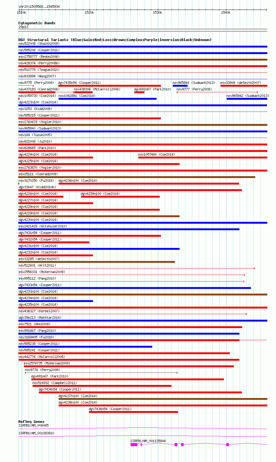 | | Variant Type | CNV gain+loss | | Copy Number | | | Allele State | | | Allele Origin | | | Probe Count | | | Validation Flag | | | Merged Status | M | | Merged Variants | dgv4233n100 | | Supporting Variants | nssv3734660, nssv3598978, nssv3598971, nssv3598966, nssv3734652, nssv3598965, nssv3598987, nssv3598986, nssv3598962, nssv3598969, nssv3734656, nssv3598973, nssv3598964, nssv3598976, nssv3598985, nssv3598982, nssv3598988, nssv3598963, nssv3598977, nssv3598989, nssv3598974, nssv3734657, nssv3598958, nssv3734659, nssv3598991, nssv3598983, nssv3598980, nssv3598961, nssv3598984, nssv3598975, nssv3598959, nssv3598979, nssv3598967, nssv3734653, nssv3598960, nssv3598981, nssv3598972, nssv3598968, nssv3734654, nssv3734658, nssv3734651, nssv3598990, nssv3598970, nssv3598957, nssv3734655 | | Samples | | | Known Genes | SIRPB1 | | Method | SNP array | | Analysis | Affymetrix SNP array copy number analysis | | Platform | Affymetrix SNP Array 6.0 | | Comments | | | Reference | Coe_et_al_2014 | | Pubmed ID | 25217958 | | Accession Number(s) | nsv1065781