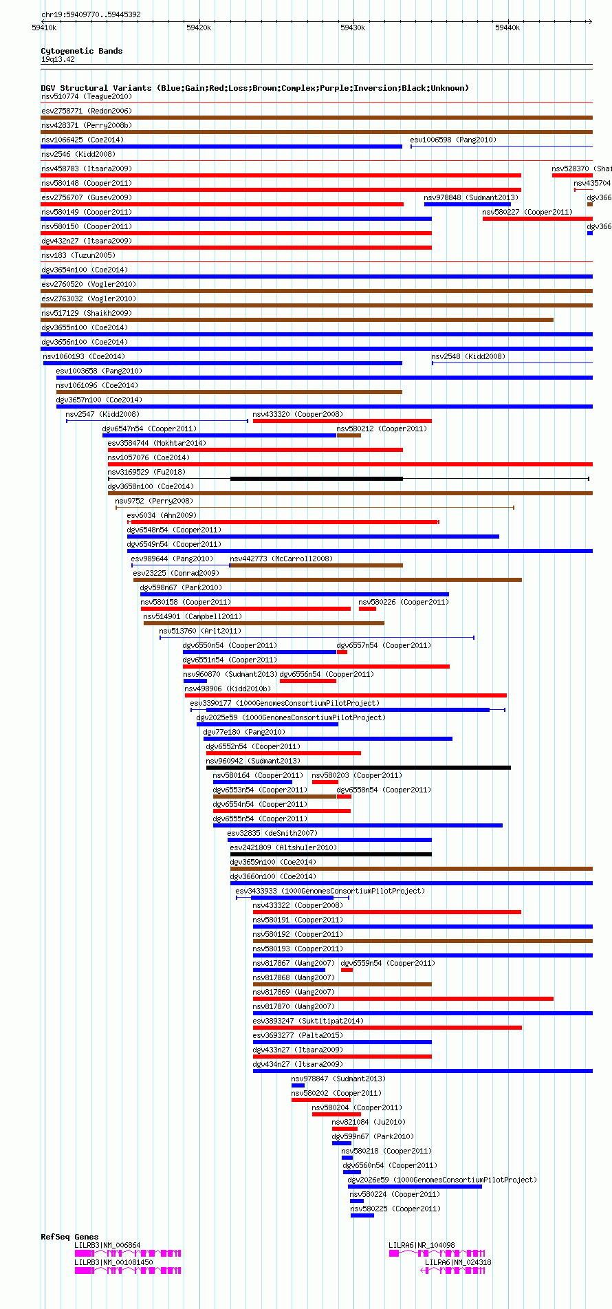 Variant DetailsVariant: nsv1065918| Internal ID | 19155137 | | Landmark | | | Location Information | | | Cytoband | 19q13.42 | | Allele length | | Assembly | Allele length | | hg38 | 35634 | | hg19 | 35623 | | hg18 | 35623 |