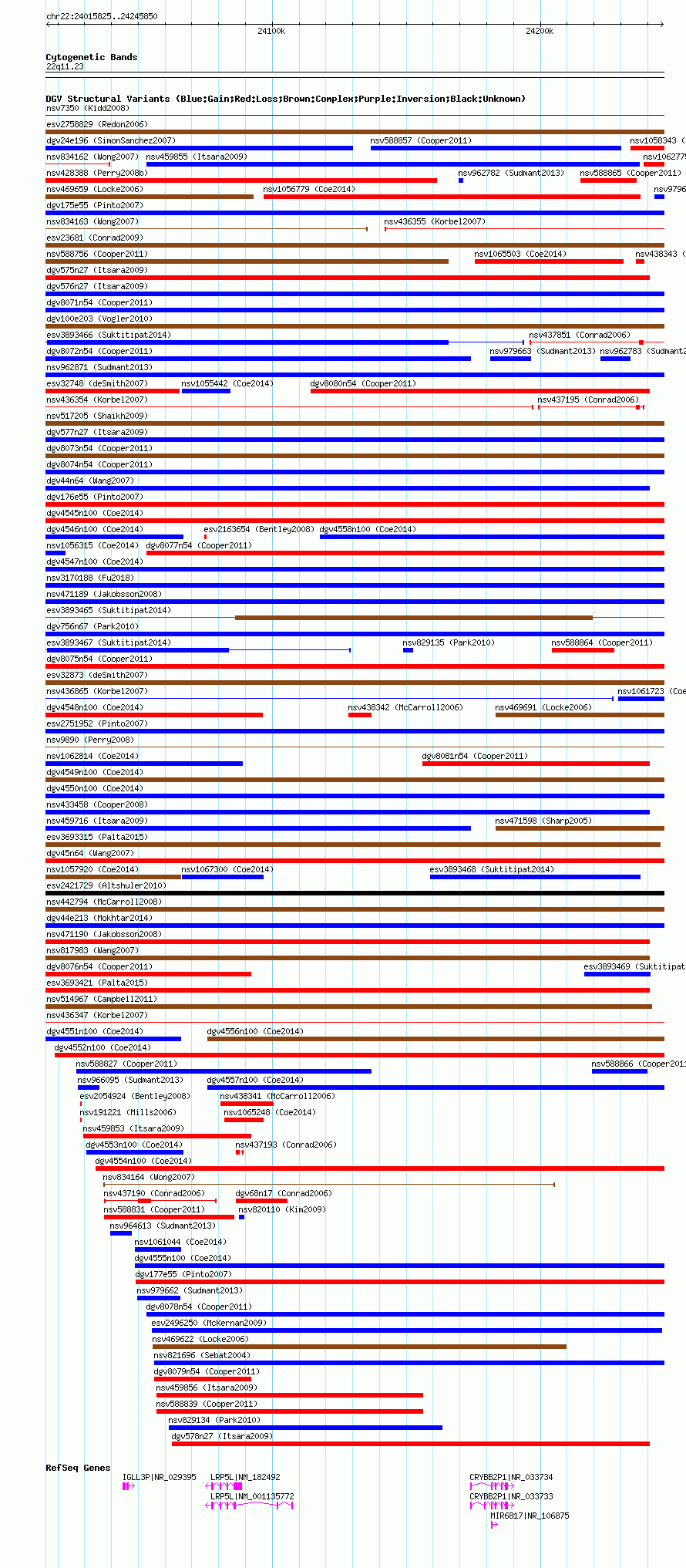 Variant DetailsVariant: nsv1066116| Internal ID | 19155335 | | Landmark | | | Location Information | | | Cytoband | 22q11.23 | | Allele length | | Assembly | Allele length | | hg38 | 230026 | | hg19 | 230026 | | hg18 | 230026 |