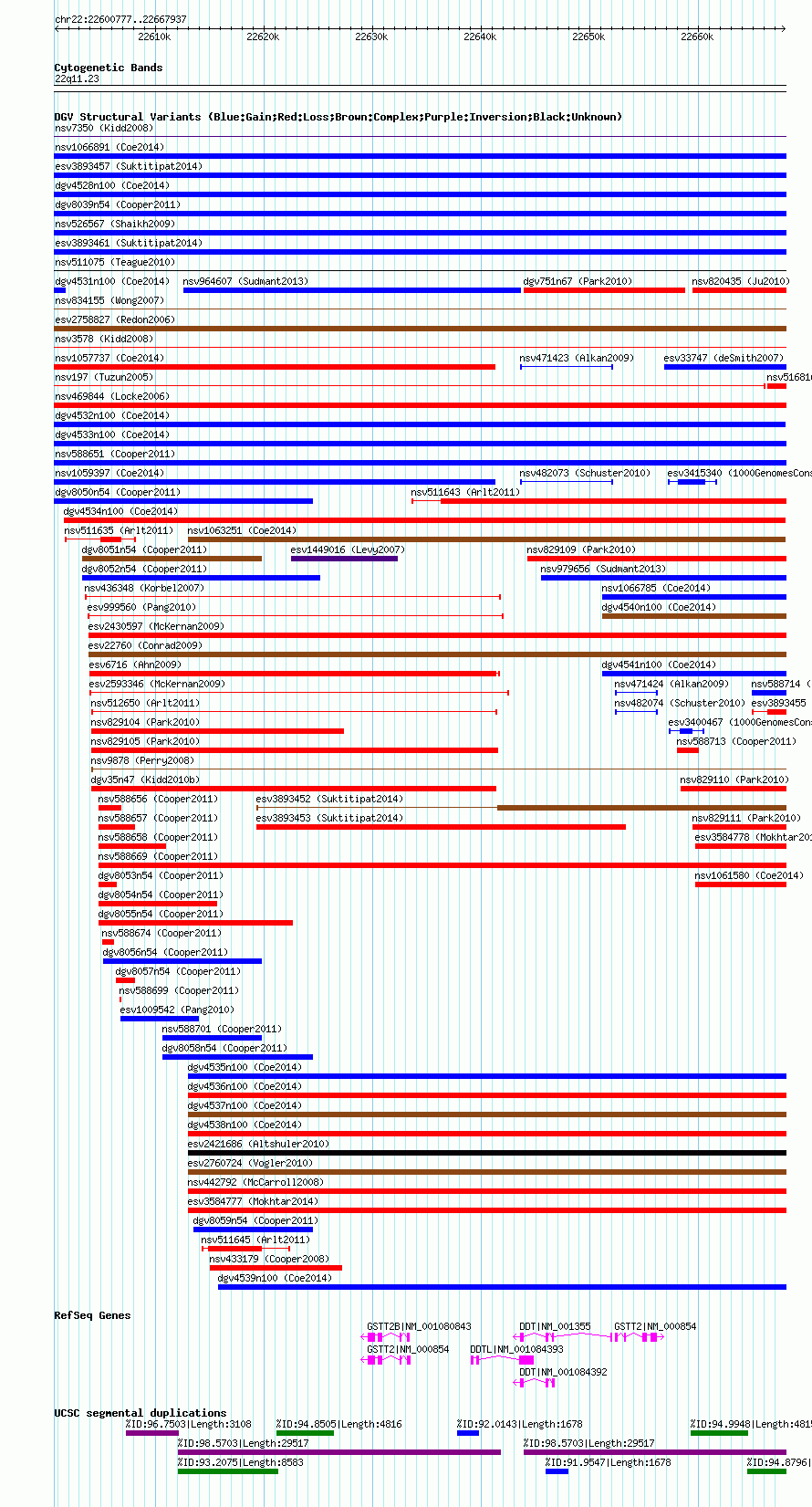 Variant DetailsVariant: nsv1066122| Internal ID | 18808653 | | Landmark | | | Location Information | | | Cytoband | 22q11.23 | | Allele length | | Assembly | Allele length | | hg38 | 67154 | | hg19 | 67161 | | hg18 | 67161 |