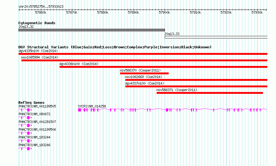 Variant DetailsVariant: nsv1066293| Internal ID | 19155512 | | Landmark | | | Location Information | | | Cytoband | 20q13.32 | | Allele length | | Assembly | Allele length | | hg38 | 80270 | | hg19 | 80270 | | hg18 | 80270 |