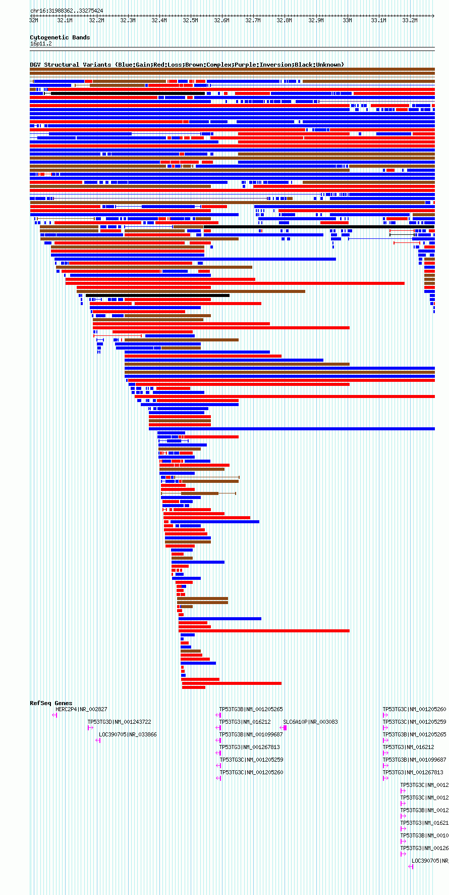 | | Variant Type | CNV loss | | Copy Number | | | Allele State | | | Allele Origin | | | Probe Count | | | Validation Flag | | | Merged Status | M | | Merged Variants | dgv2842n100 | | Supporting Variants | nssv3716244 | | Samples | | | Known Genes | HERC2P4, LOC390705, SLC6A10P, TP53TG3, TP53TG3B, TP53TG3C, TP53TG3D | | Method | SNP array | | Analysis | Affymetrix SNP array copy number analysis | | Platform | Affymetrix SNP Array 6.0 | | Comments | | | Reference | Coe_et_al_2014 | | Pubmed ID | 25217958 | | Accession Number(s) | nsv1066362