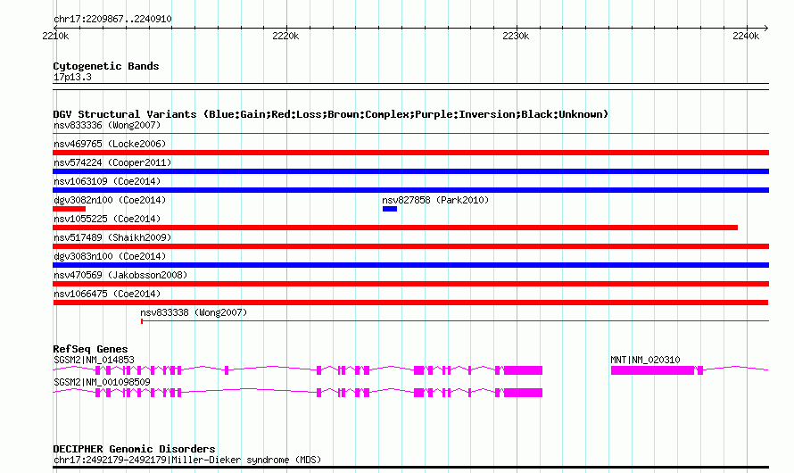 | Variant Type | CNV loss | Copy Number | | Allele State | | Allele Origin | | Probe Count | | Validation Flag | | Merged Status | M | Merged Variants | | Supporting Variants | nssv3560079 | Samples | | Known Genes | MNT, SGSM2 | Method | SNP array | Analysis | Affymetrix SNP array copy number analysis | Platform | Affymetrix SNP Array 6.0 | Comments | | Reference | Coe_et_al_2014 | Pubmed ID | 25217958 | Accession Number(s) | nsv1066475