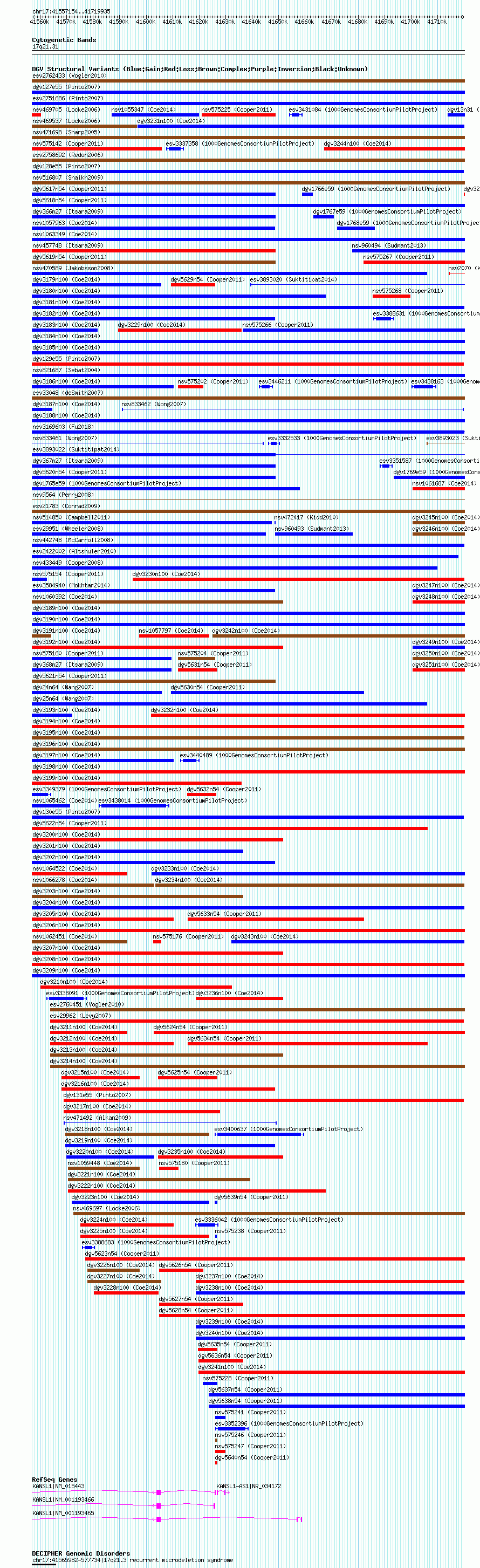 Variant DetailsVariant: nsv1066501| Internal ID | 19155720 | | Landmark | | | Location Information | | | Cytoband | 17q21.31 | | Allele length | | Assembly | Allele length | | hg38 | 162783 | | hg19 | 162783 | | hg18 | 162782 |